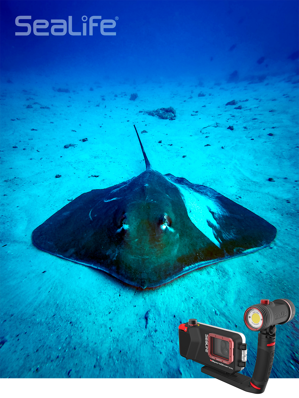 Rays create nice silhouettes to photograph from below due to their unique body shapes. However, they often sit on the ocean floor and rest. Use this opportunity to approach the stingray slowly, centering your shot from slightly above, and keeping some blue water in the background. The center position is great way to frame your subject with good contrast, especially on white sand.