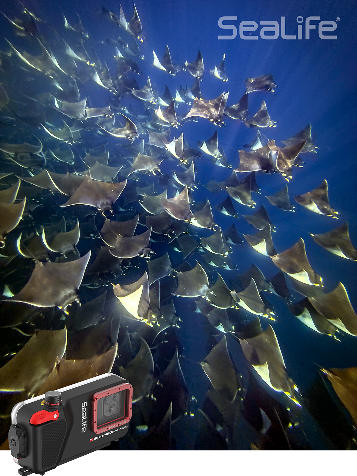 Distance is very important in underwater photography. Water is very dense when you’re distant from your subject, which will soften your images. To avoid this, you’ll want to get as close as possible. And sometimes it’s easier to frame just a part of the scene, like this huge fever of Mobula Rays.