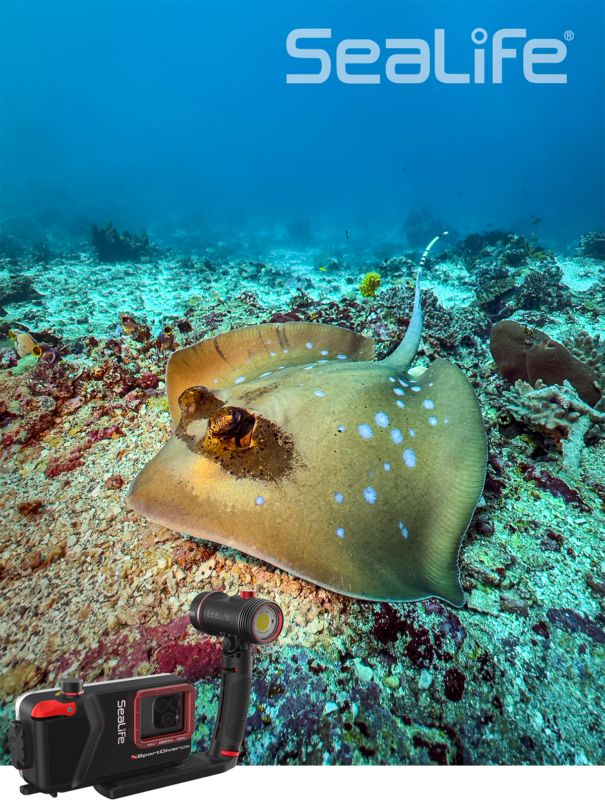 When framing subjects like this Stingray, a 45-degree angle creates a remarkable composition. You can also try centering your subject's placement if it’s more convenient. Getting close to an animal like this means you’ll need to add some light for color, and to brighten your foreground by using a Sea Dragon Photo-Video Light.
